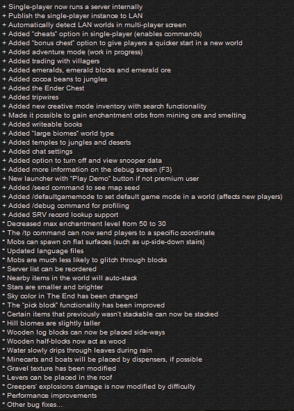 The new LAN feature is incredible. It allows players connected to the same router to play with you, no 'Minecraft Server.exe' needed. They also added an in-game cheat feature, which is supposedly similar to SPC (SinglePlayerCommands), which I think is almost nothing like it. Sure, it has commands, but very, very limited. SPC has around a hundred plus. Mojang also changed the default gravel texture, which was a positive improvement. At last, gravel doesn't look so ugly.